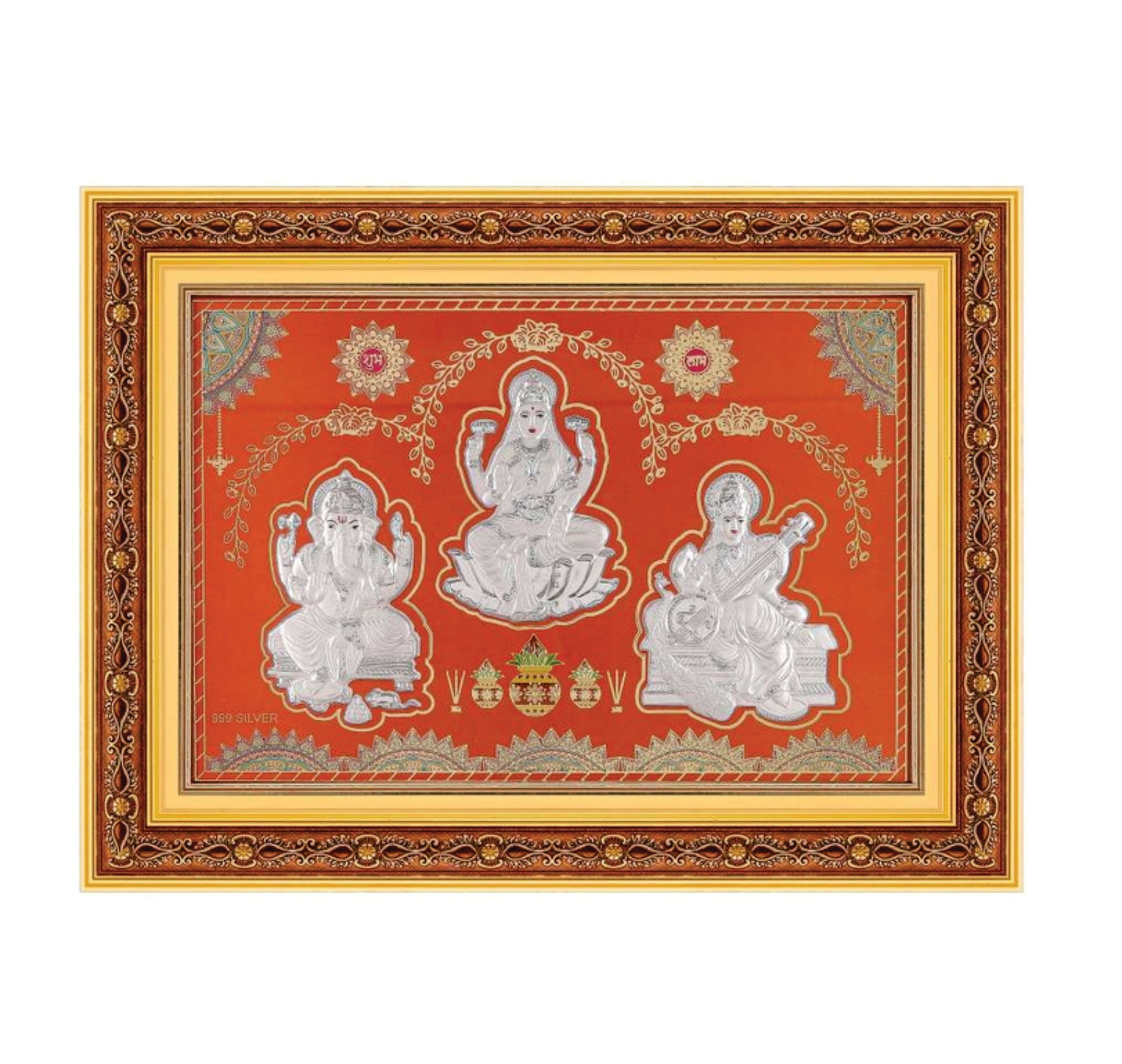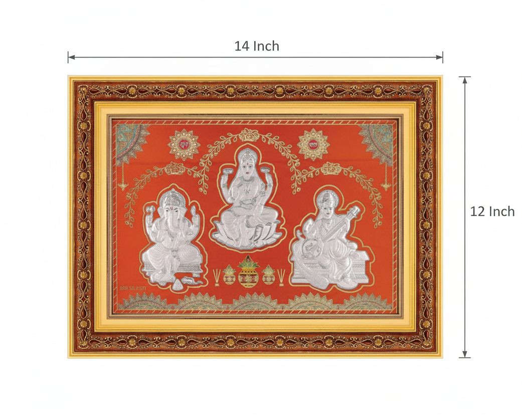 • Elegant and unique Laxmiji-Ganeshji-Saraswatiji Tri Murti Frame idol for Pooja, Temple and Gifts
